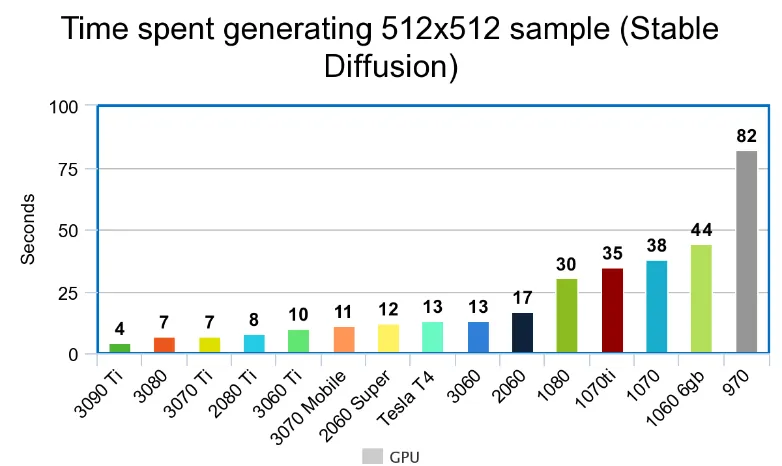 注意:过度使用,显卡会有损坏的风险。进行 512x 图片生成时主流显卡速度对比: