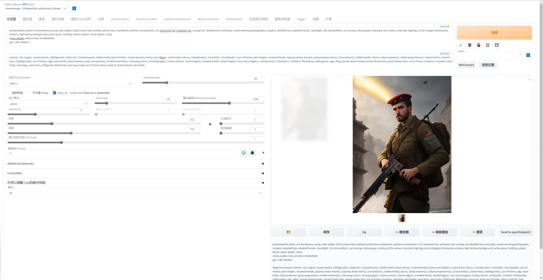 可以用更多的采样步骤来抵消。过高的 CFG Scale 体现为粗犷的线条和过锐化的图像。一般开到 7~11。