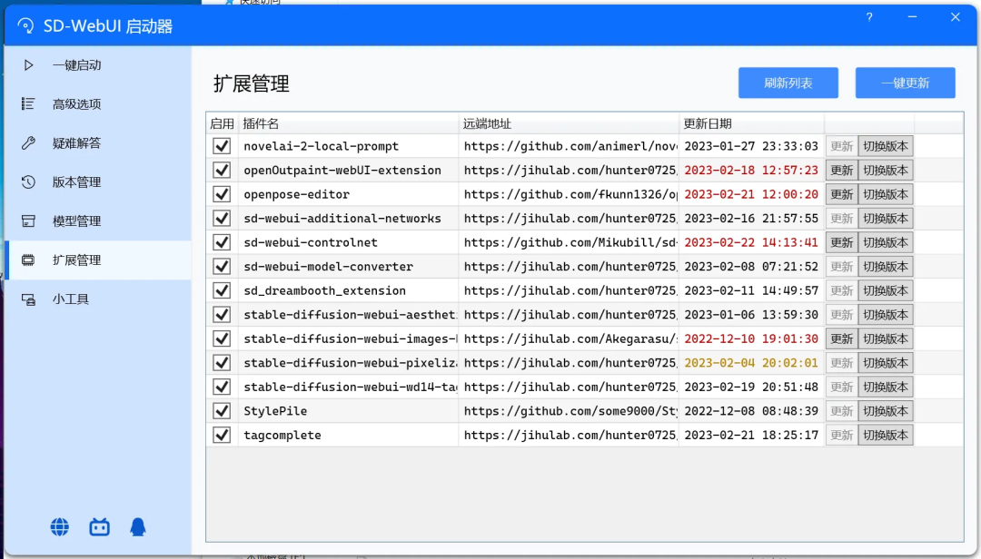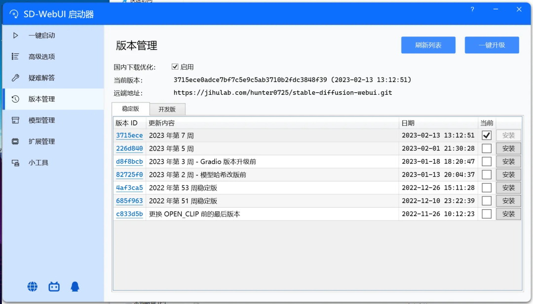 Stable Diffusion webui 的更新比较频繁,请根据需求在“版本管理”目录下更新: