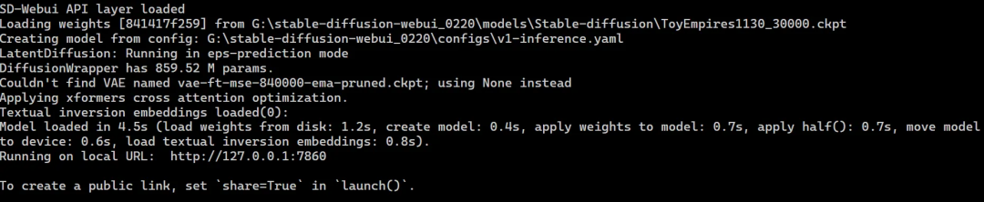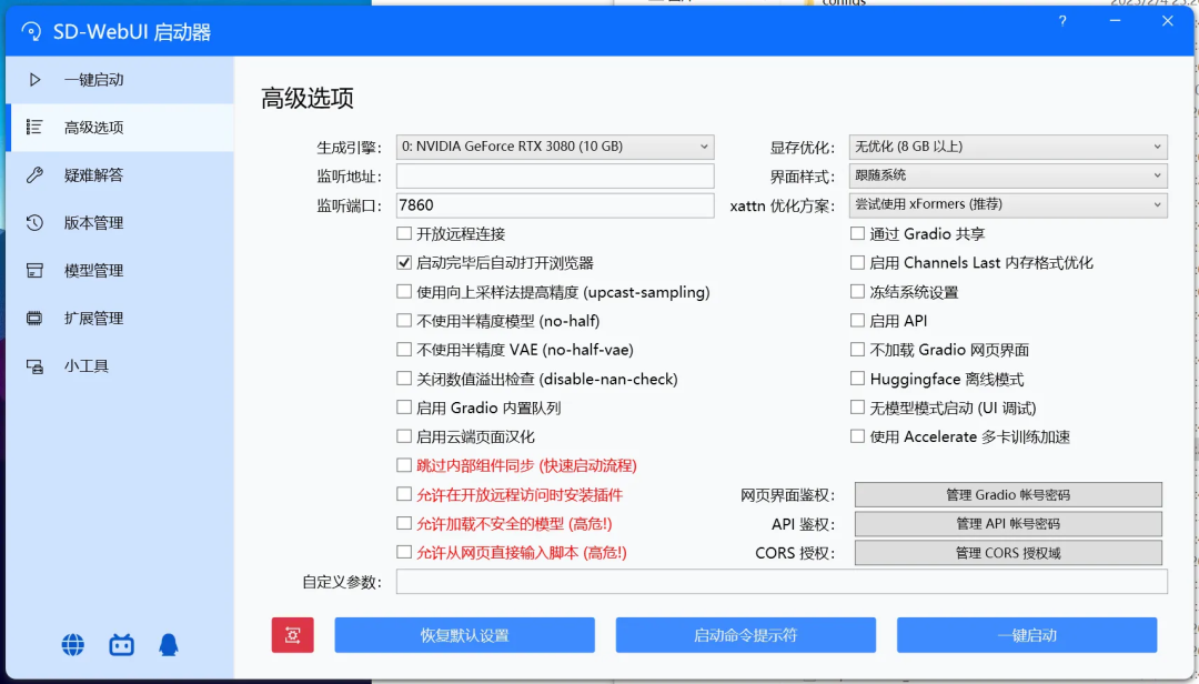 xFormers 能极大地改善内存消耗和速度,建议开启。准备工作完毕后,点击一键启动即可。等待浏览器自动跳出,或是控制台弹出本地 URL 后说明启动成功。