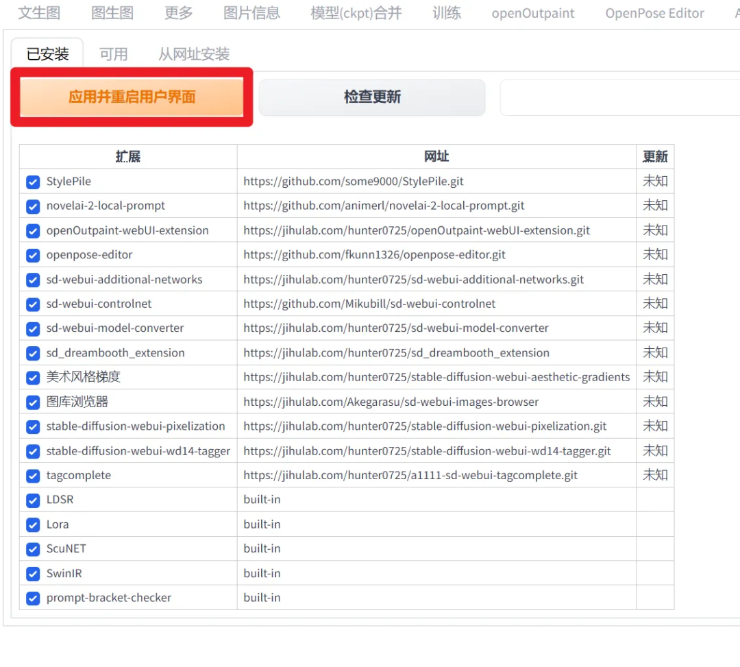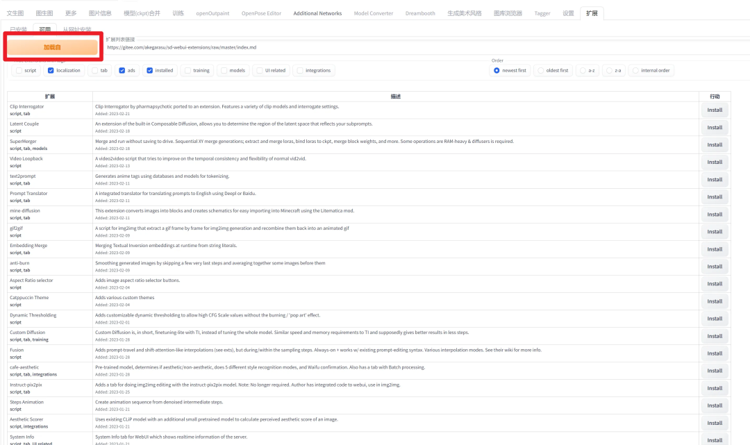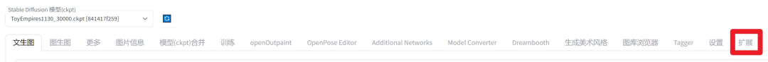Stable Diffusion 可配置大量插件扩展,在 webui 的“扩展”选项卡下,可以安装插件: