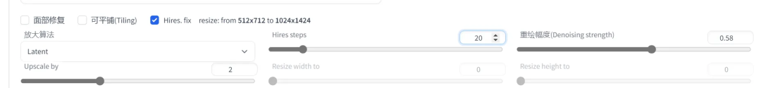 通过勾选 “Highres. fix” 来启用。默认情况下,文生图在高分辨率下会生成非常混沌的图像。如果使用高清修复,会型首先按照指定的尺寸生成一张图片,然后通过放大算法将图片分辨率扩大,以实现高清大图效果。最终尺寸为(原分辨率* 缩放系数 Upscale by)。
