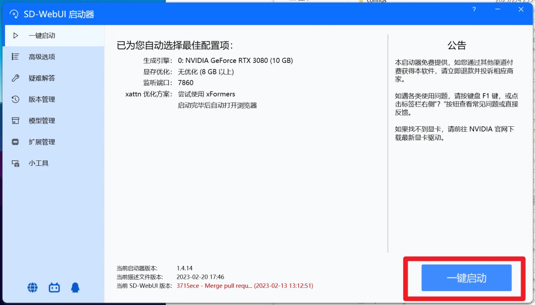 觉得上述步骤麻烦的开发者可以直接使用整合包,解压即用。 比如独立研究员的空间下经常更新整合包。秋叶的启动器也非常好用,将启动器复制到下载仓库的目录下即可,更新管理会更方便。
